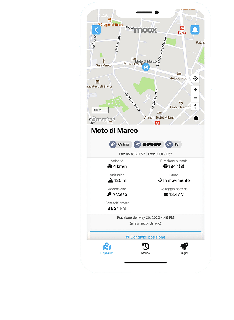 I localizzatori GPS MOOX Track inviano la posizione ai nostri server ad intervalli regolari, così anche in caso di furto o distruzione del dispositivo potrai sempre consultare gli spostamenti registrati.