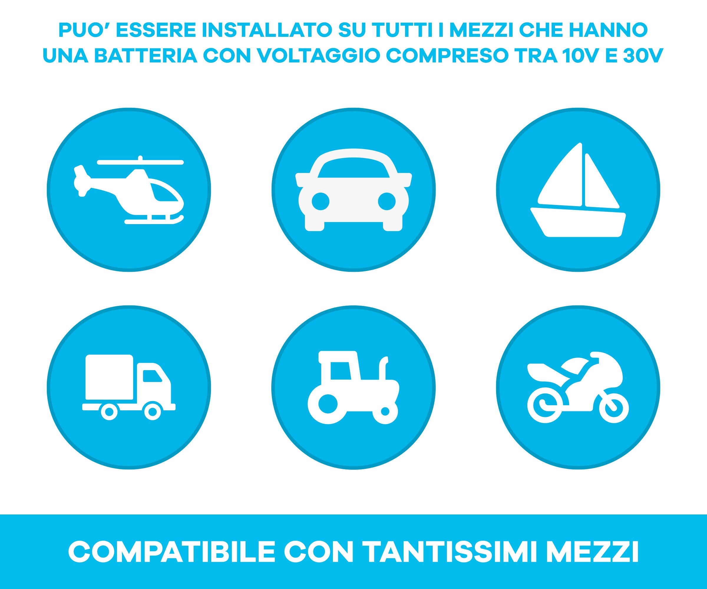 Per l’installazione basta collegare tre fili, il tuo professionista di fiducia potrà farlo in pochi minuti. E’ compatibile con auto, moto, camion, barche, e ogni mezzo con batteria da 10V a 30V.