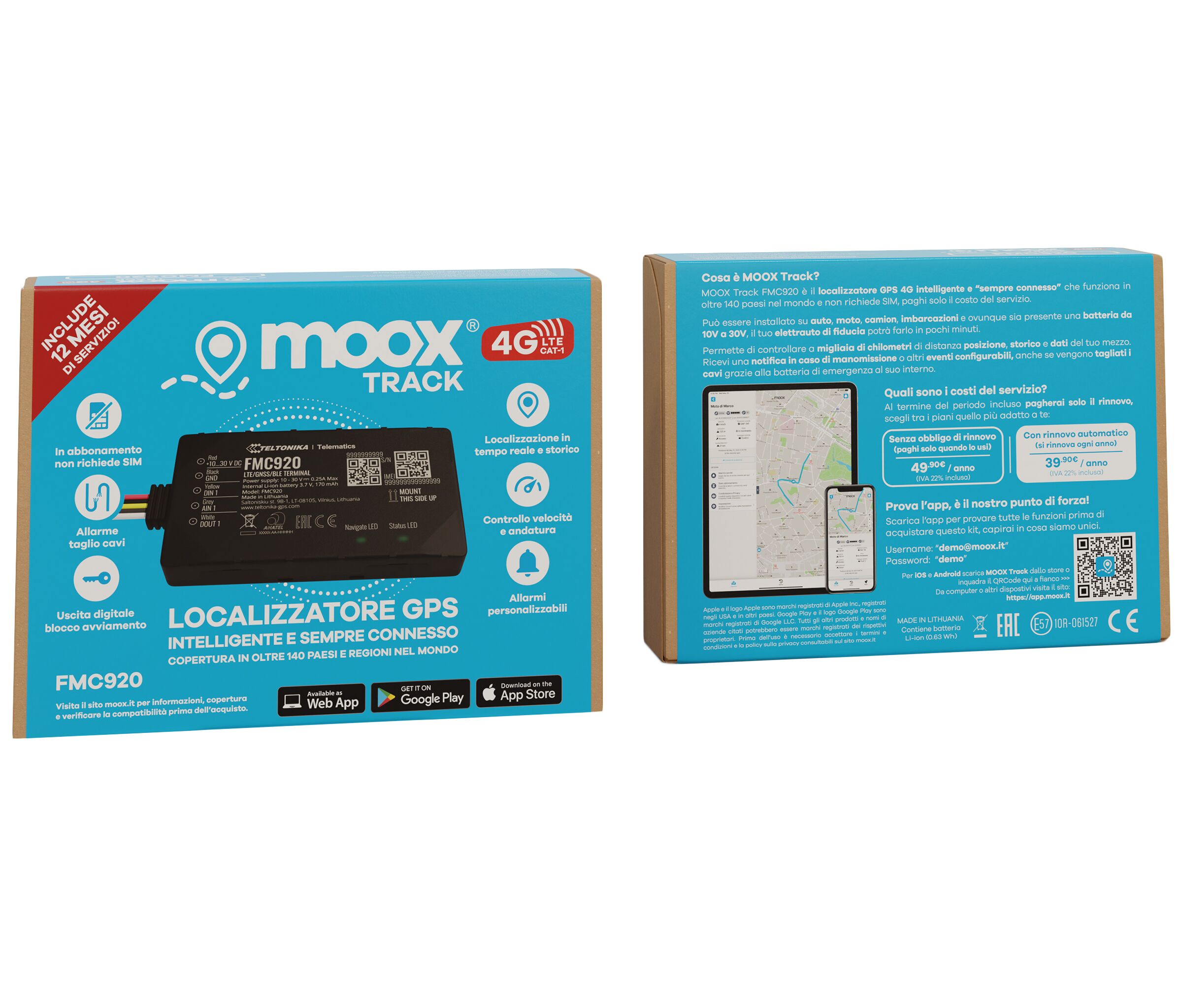 MOOX Track è un localizzatore GPS professionale sempre connesso grazie alla SIM integrata, che non dovrai mai ricaricare, è inclusa nell’abbonamento e con questo kit i primi 12 mesi sono gratis.
